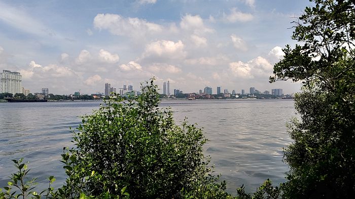 South Liine) に、タクシーでスンゲイブロウ湿地保護区(Sungei Buloh Wetland Reserve)に着いた。海の向こう約1km先はマレーシア・ジョホールバールである。 |