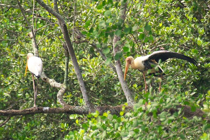 木道を戻り、園路を進むとインドトキコウが樹木に、水面付近の流木にイソシギを見つけた。