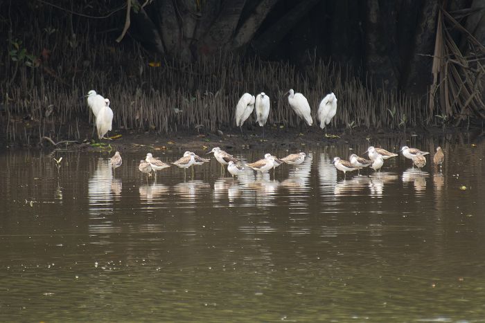 橋を渡って中州の湿地にコサギ、アオアシシギ、アカアシシギの群がいた。 |