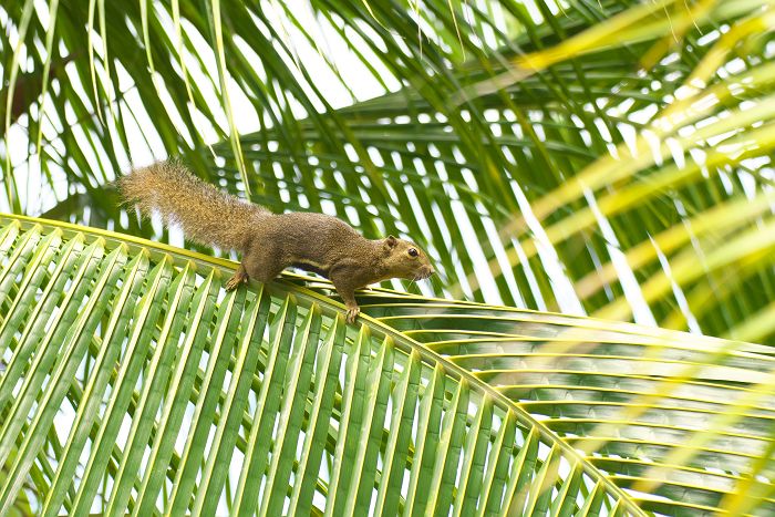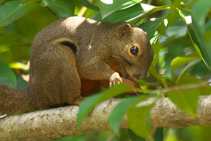 | さすが熱帯で陽ざしが強く、トカゲが園路のあちこちで日光浴をしていて、リスは何かを食べていた。 |